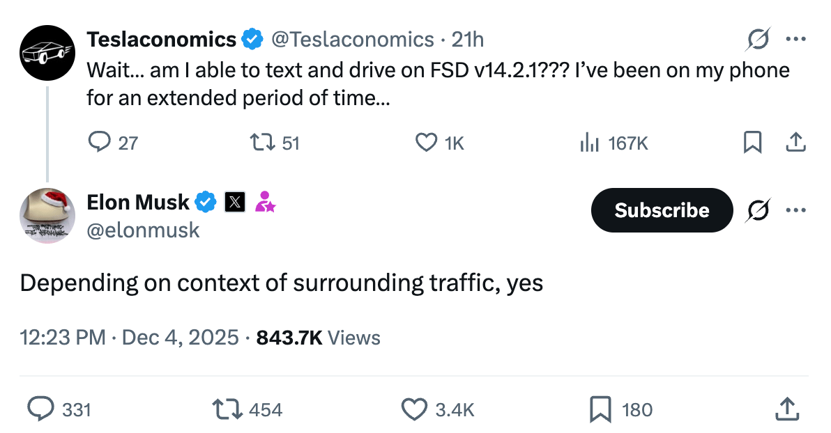 Musk took a break from posting racist and xenophobic screeds yesterday to confirm that the latest version of Tesla’s Full Self-Driving software would allow for some instances of texting while driving, despite it being incredibly unsafe and illegal in 49 states, Washington, DC, and the US territories. (Montana, wyd?) “Depending on context of surrounding traffic, yes,” Musk replied to the question of whether FSD v14.2.1 would allow the illegal behavior.