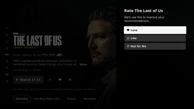 HBO Max is rolling out a new rating system that allows you to share feedback about the shows and movies you watch. The streaming service will tweak your recommendations based on whether you select the “Love,” “Like,” or “Not For Me” options.