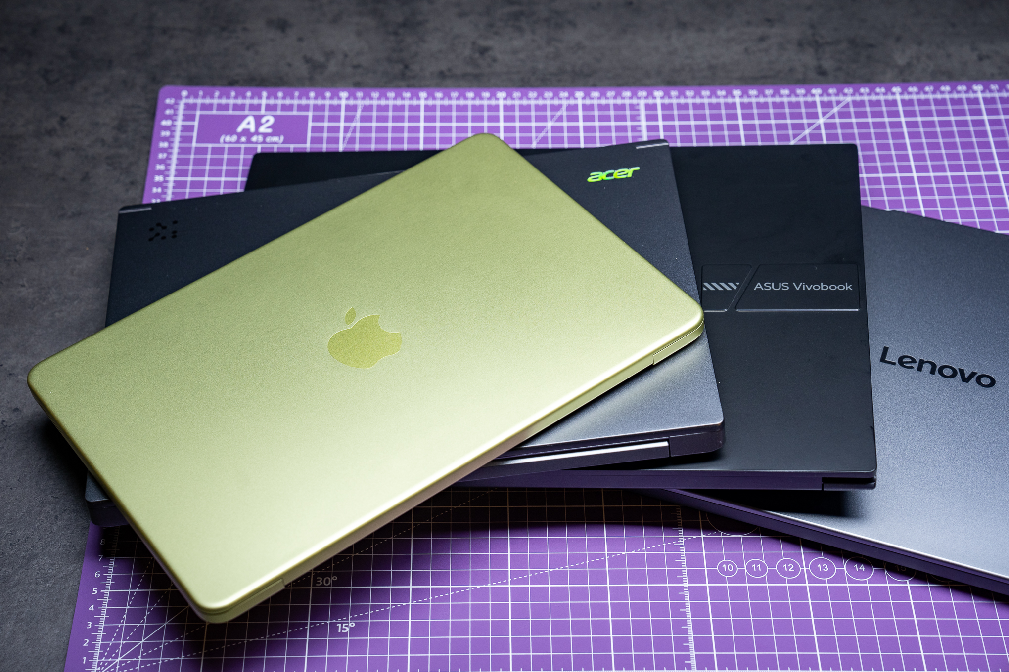 A citrus colored MacBook Neo sits atop three Windows laptops: a Lenovo, an Asus, and an Acer.