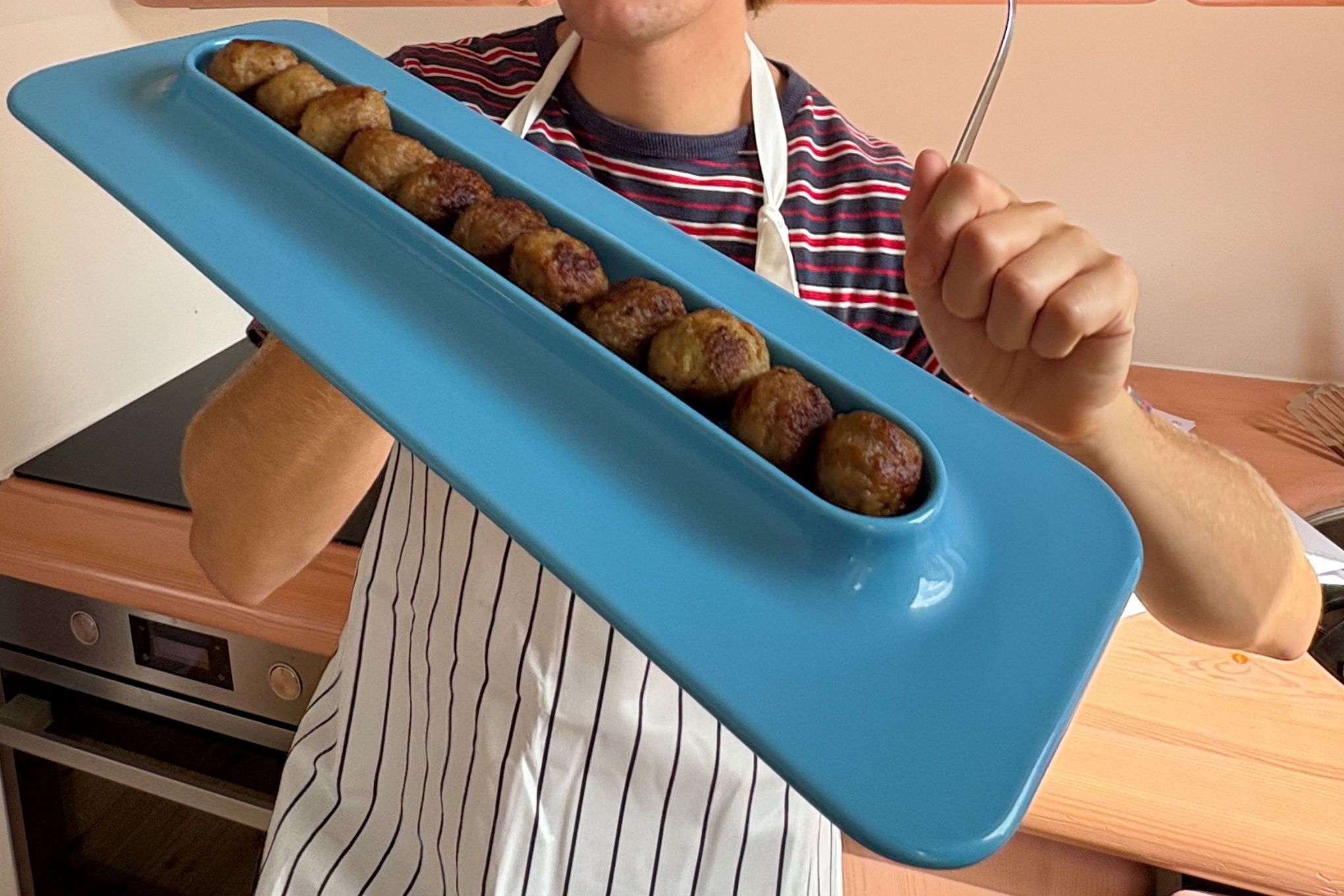 “I love designing objects for a specific function – it brings a touch of humor and makes them instantly easy to grasp. In Sweden, meatballs mean Christmas, and this plate is my way of honoring that tradition,” says Westman. “The design is simple, lining up the meatballs so each one is visible, like they’re sitting on little thrones. And while it was created with meatballs in mind, it works just as well for many other dishes.”