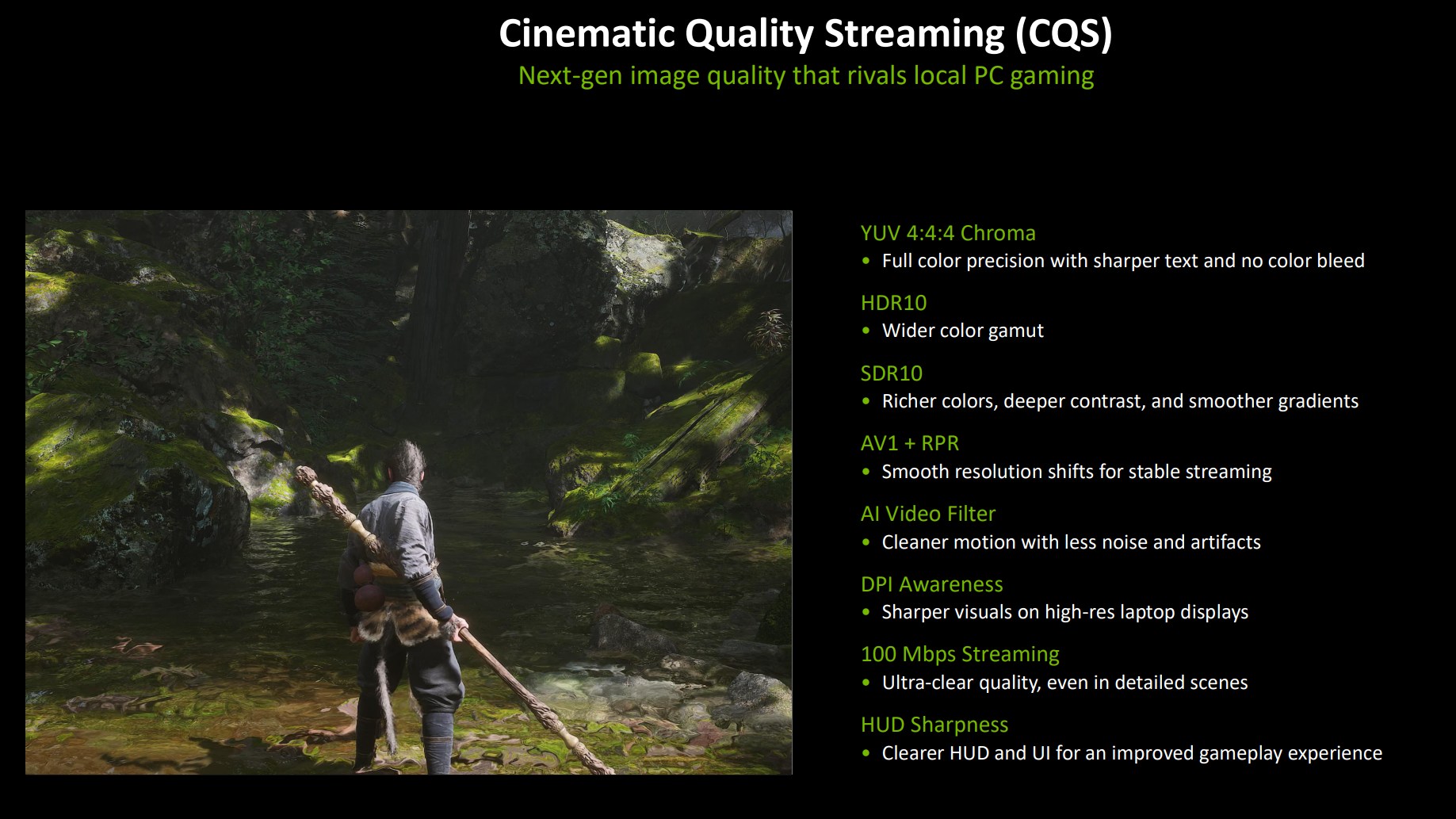 There’s also a new optional Cinematic Quality Streaming mode you can toggle that Nvidia claims can reduce color bleed and restore detail to dark and blurry areas of a scene as it’s streamed over the net, and you can now stream at up to 100Mbps, up from 75Mbps previously, to help maintain that quality. (It uses HDR10 and SDR10, with YUV 4:4:4 chroma sampling, streamed over AV1 with an added AI video filter and some optimizations for clearer text and HUD elements.)