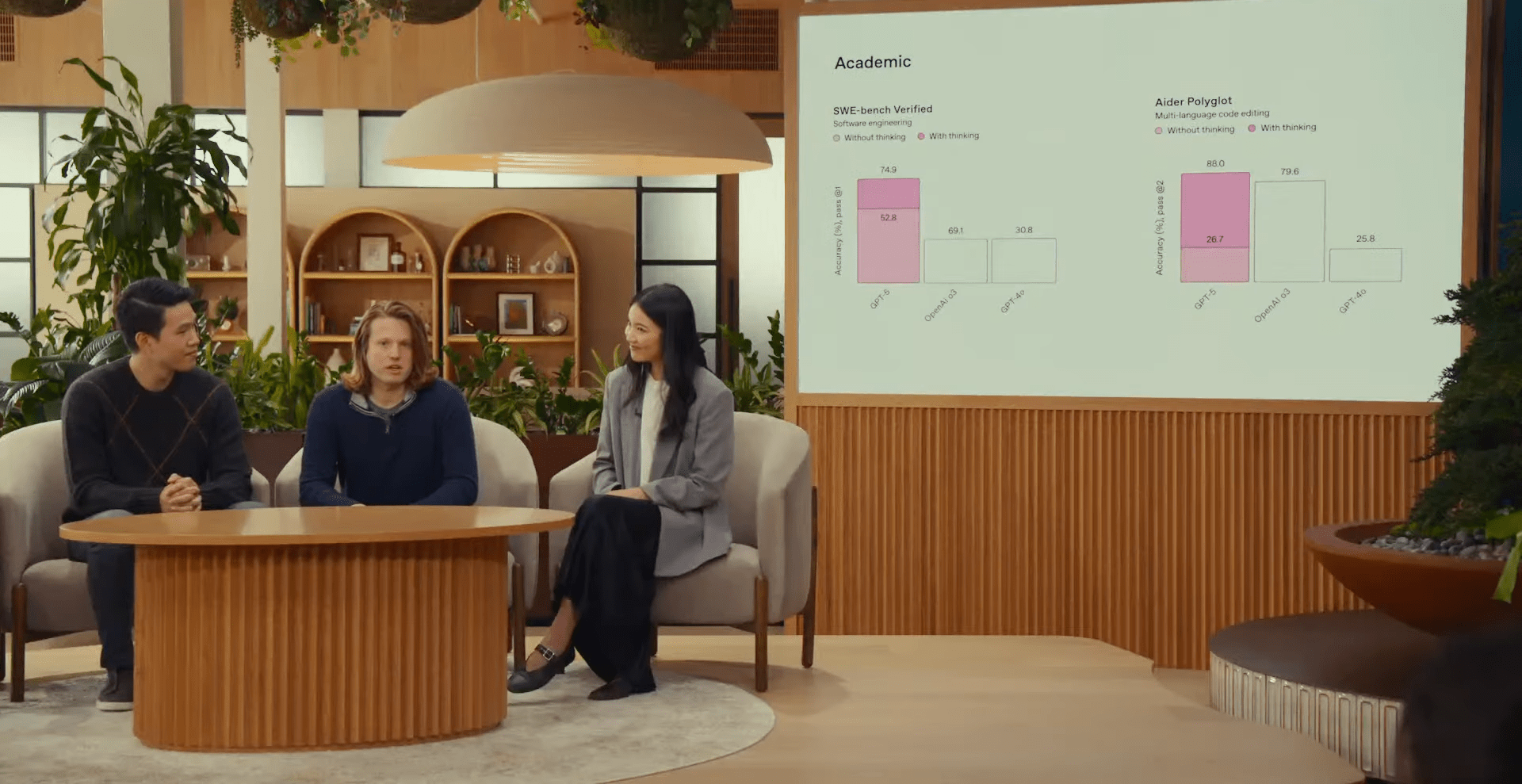 In one, ironically showing how well GPT-5 does in “deception evals across models,” the scale is all over the place. For “coding deception,” for example, the chart shown onstage says GPT-5 with thinking apparently gets a 50.0 percent deception rate, but that’s compared to OpenAI’s smaller 47.4 percent o3 score which somehow has a larger bar. OpenAI appears to have accurate numbers for this chart in its GPT-5 blog post, however, where GPT-5’s deception rate is labeled as 16.5 percent.