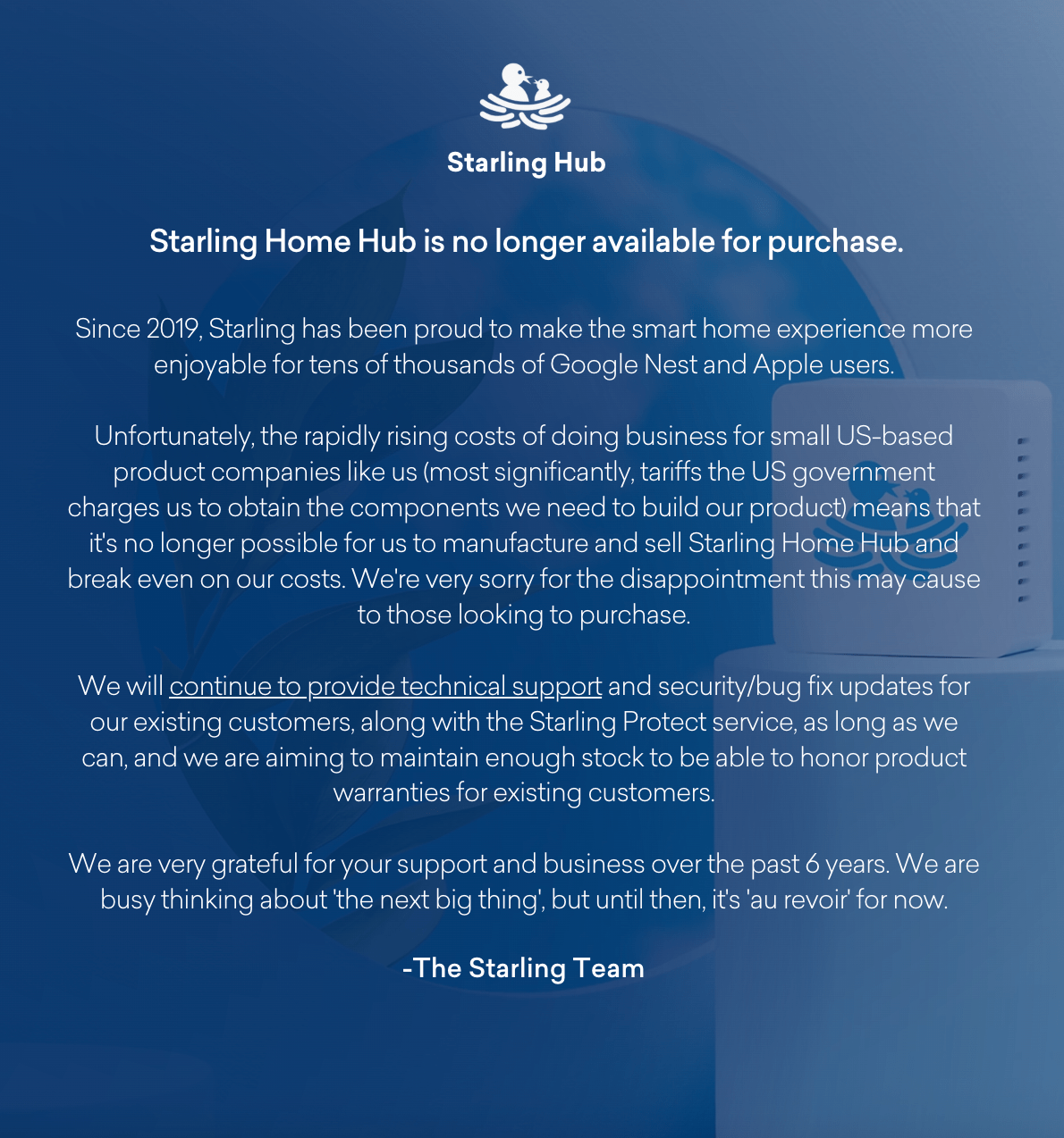 In a message on its website, Starling said it can no longer manufacture the hub due to “rapidly rising costs of doing business for small US-based product companies like us (most significantly, tariffs the US government charges us to obtain the components we need to build our product).”
