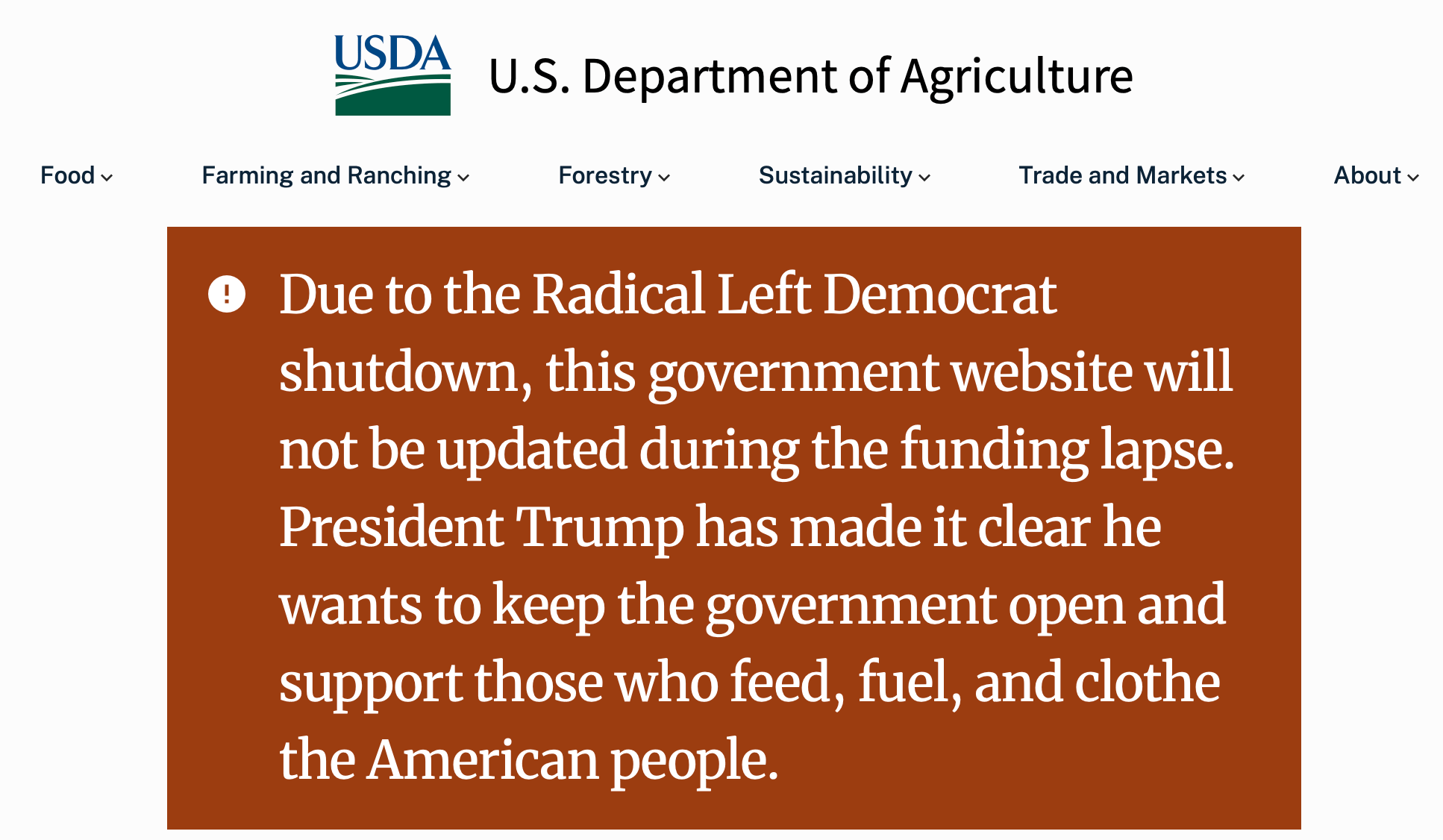 The Trump administration has put up banners across federal websites blaming Democrats for the government shutdown, and in some cases, blatantly campaigning for President Donald Trump. One banner on the US Department of Agriculture’s site says, “The Radical Left Democrats shut down the government,” adding that “President Trump has made it clear he wants to keep the government open and support those who feed, fuel, and clothe the American people.”