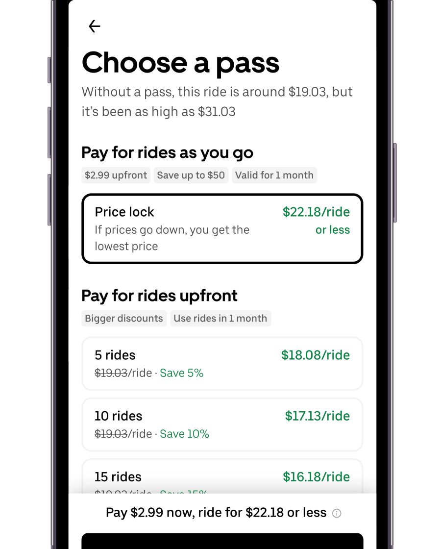Taken together, prepaid passes and price locks are aimed at encouraging loyalty and more frequent trips with certain customers. If you’re the type of person who would consider using Uber more than twice a week for a commute, then Uber wants to draw you further into its ecosystem by throwing discounts and other incentives at you.
