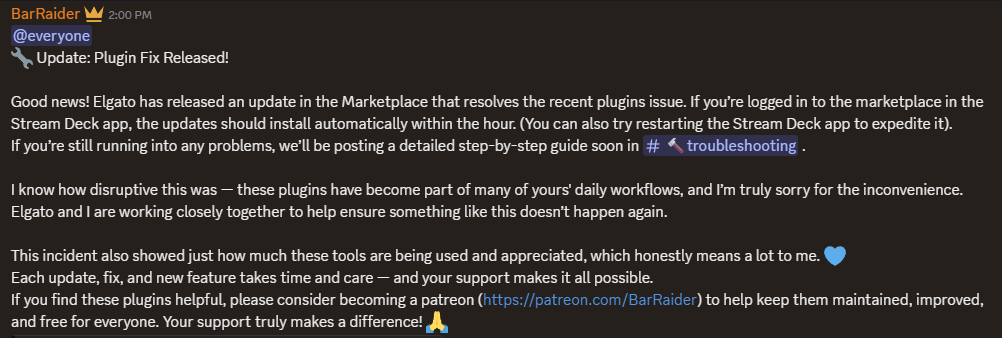 Here’s the BarRaider update and an apology:
